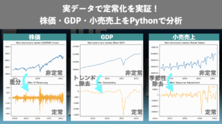 データサイエンス Pythonで実証!実データに定常化手法を適用してみる(株価・GDP・売上データ) 株価・GDP・小売売上という実データを使い、差分・トレンド除去・季節調整による定常化をPythonで実証します。非定常性の原因を見極め、図示とADF検定で処理前後を比較しながら、実務で使える前処理の考え方を整理します。 2026.04.08 データサイエンス