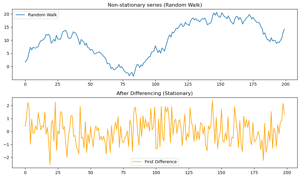 ここではランダムウォークに近い非定常データを生成し、ARIMAモデル(次数は(1,1,1)を仮定)を当てはめて定常化を確認します。