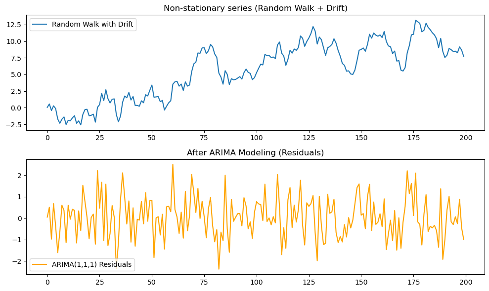 titles=["Non-stationary series (Random Walk + Drift)", "After ARIMA Modeling (Residuals)"]