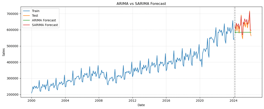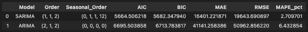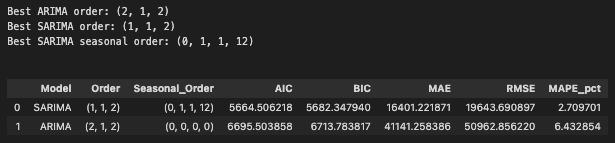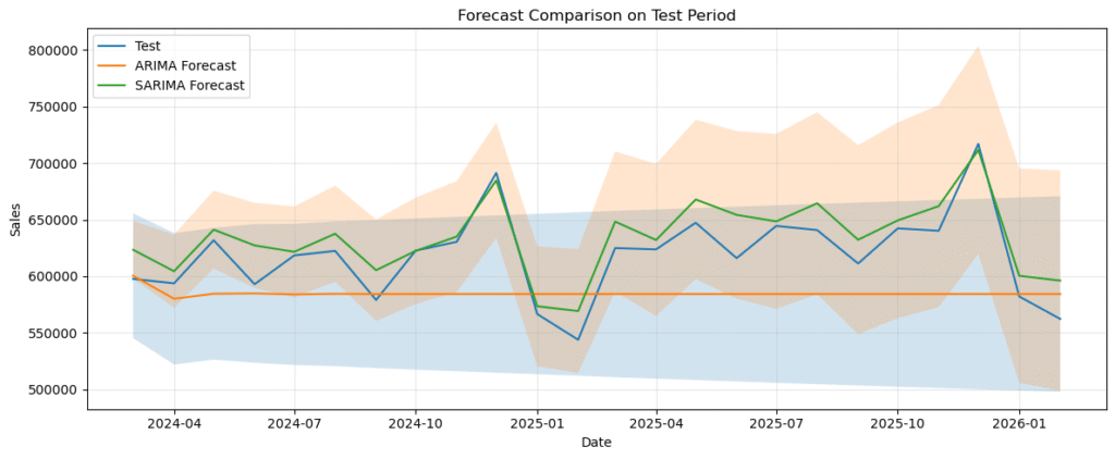 この結果は、SARIMA が売上系列の季節構造を取り込めていることを示しています。