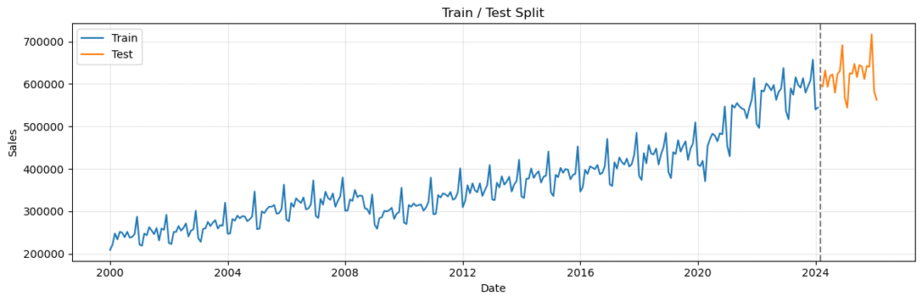 本記事では、単変量時系列モデルの代表である ARIMA と SARIMA を取り上げ、月次の小売売上データに対して Python で比較します。具体的には、学習データとテストデータに分割したうえで、両モデルを適用し、
