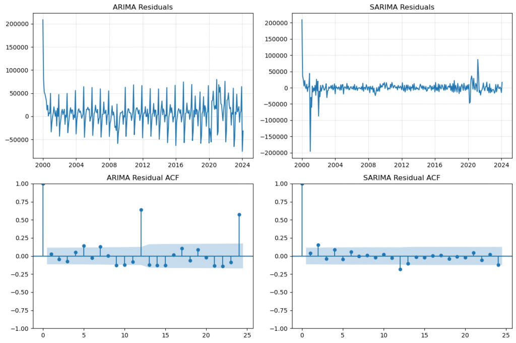 – 残差診断でも SARIMA のほうが季節構造をより取り切れていた