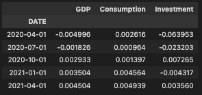 一方で、その後の推移を見ると、VAR(3) の予測は、大きなショックの後に各系列の成長率がゼロ近傍へ戻っていくという大まかな方向感を捉えています。GDP と消費では特にその傾向が見やすく、極端な乱高下を再現することはできなくても、ショック後の落ち着きどころはある程度追えているといえます。この背景には、コロナ禍での経済ショックからの立ち直りが、過去の経済ショックからの立ち直りと似たの推移であることがあります。