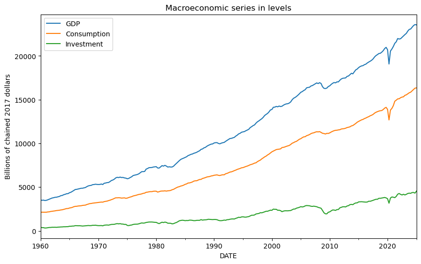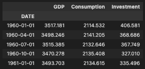 ここでは、VAR を適用するために使用するデータを確認します。今回のポイントは、複数の時系列データを同じ時間軸でそろえたうえで、系列間の関係を見にいける題材を選ぶことです。第5回・第6回と同様に、本記事でも FRED からデータを取得します。今回使用する 3 系列はいずれも FRED から四半期データとして取得できます。