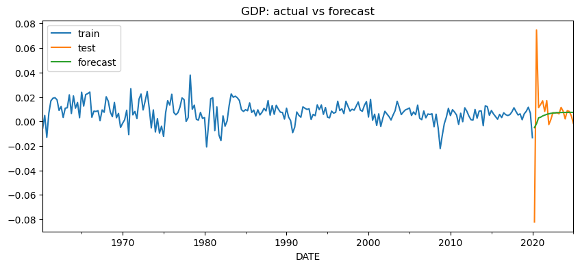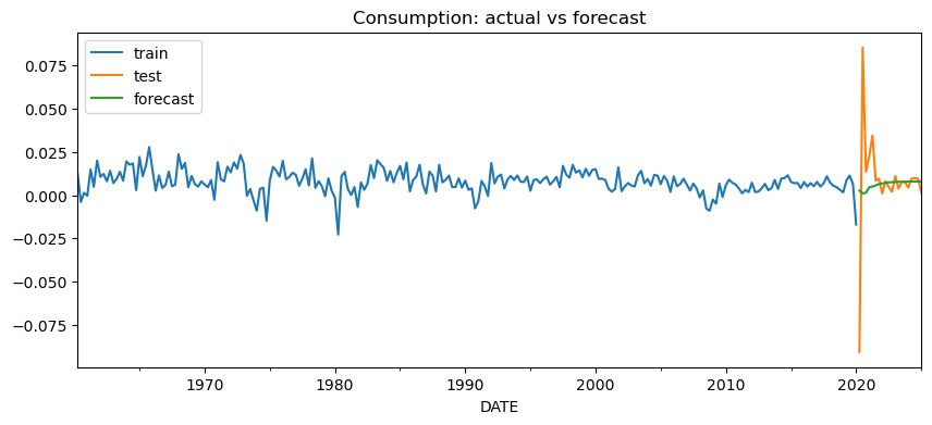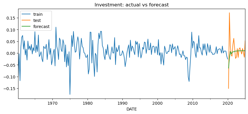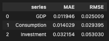 この結果から、投資系列の予測誤差が最も大きいことがわかります。これは、対数差分後のプロットでも見られたように、投資が GDP や消費よりも変動の大きい系列であることと整合的です。逆に、GDP と消費は比較的安定しており、誤差も投資より小さくなっています。