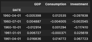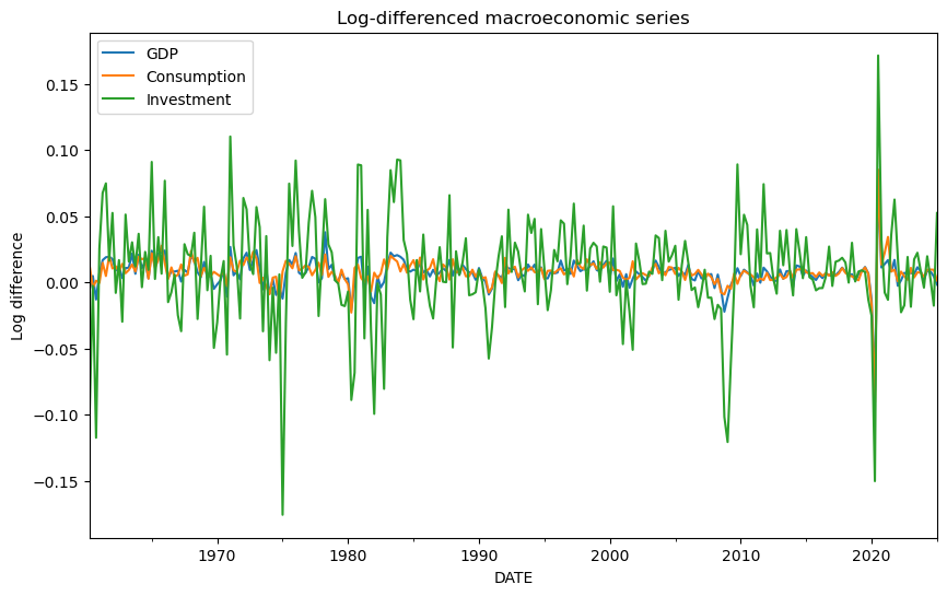 - 対数差分をとることで、3 系列とも定常とみなせる形に整えられた