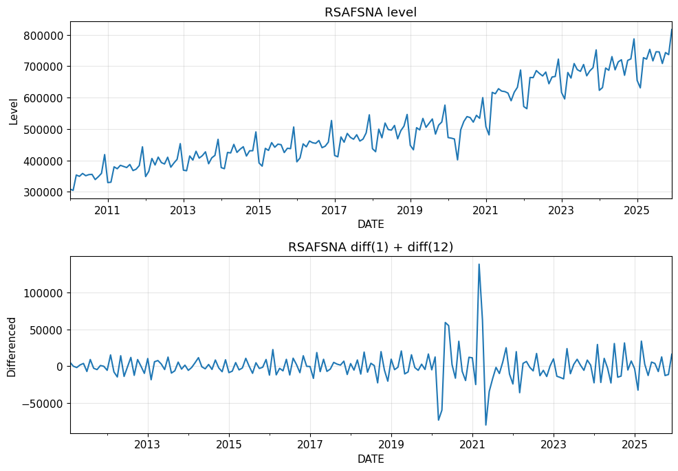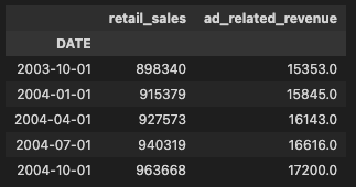 この例では、前処理に入る前にすでに 1 つ重要な操作がありました。それが頻度をそろえることです。小売売上は月次系列なので、四半期系列と比較するには集約が必要でした。