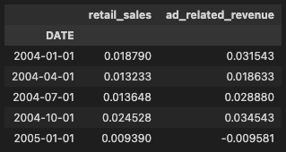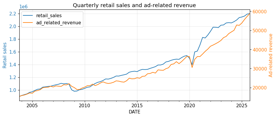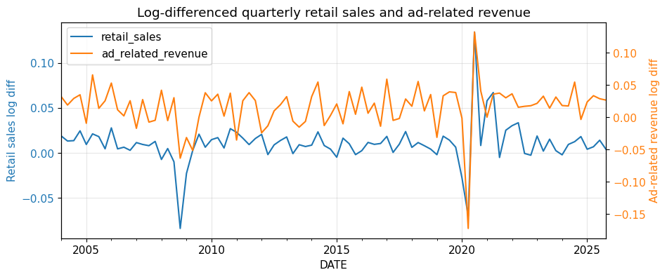 title="Log-differenced quarterly retail sales and ad-related revenue",