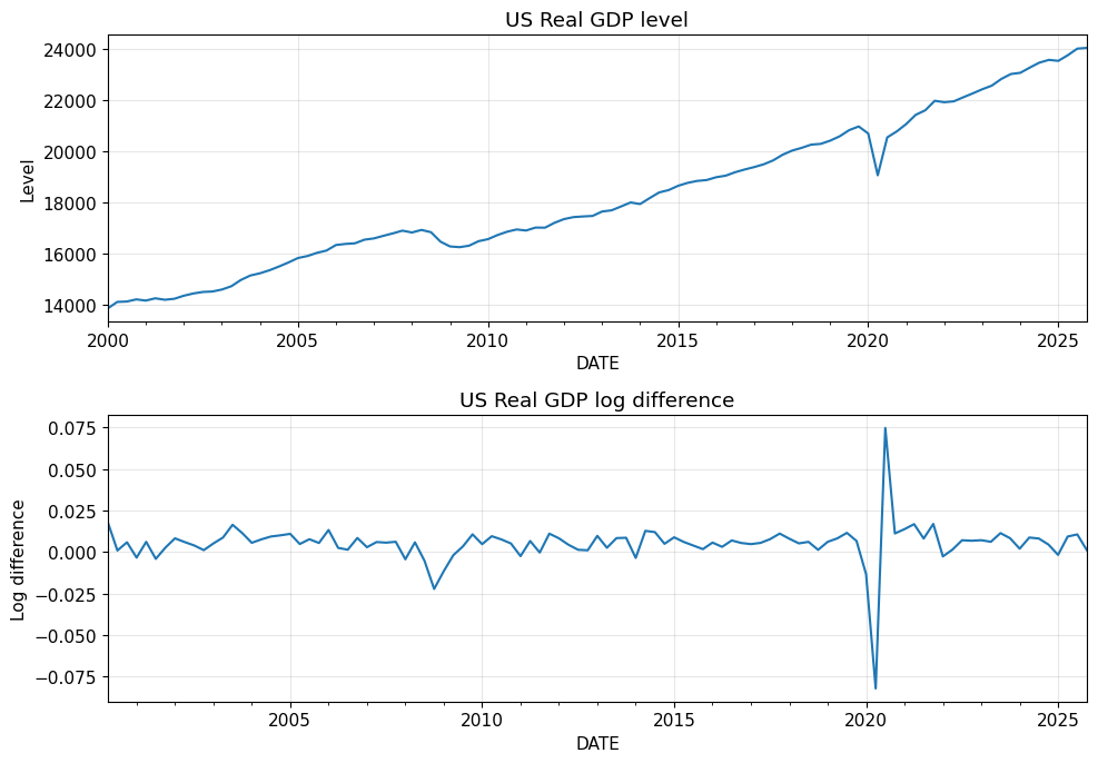 実際に確認したように、実質GDPではトレンドが主な論点になり、小売売上では季節性も含めて考える必要がありました。また、複数系列を扱う場合には、差分の前に頻度をそろえる必要があることも分かりました。つまり、時系列分析では「非定常なら差分」「複数系列なら VAR」のように機械的に進めることはできません。系列の性質に応じて、どの処理が必要かを判断することが出発点になります。